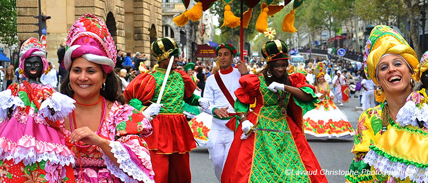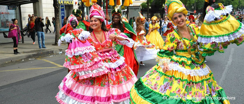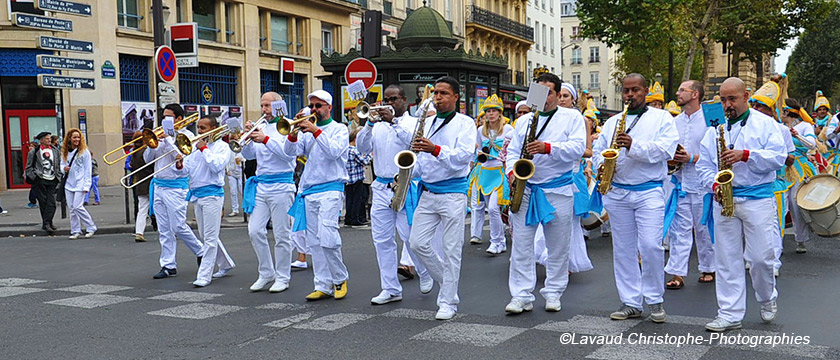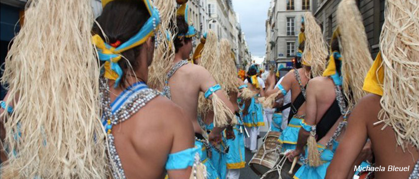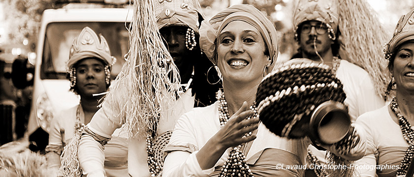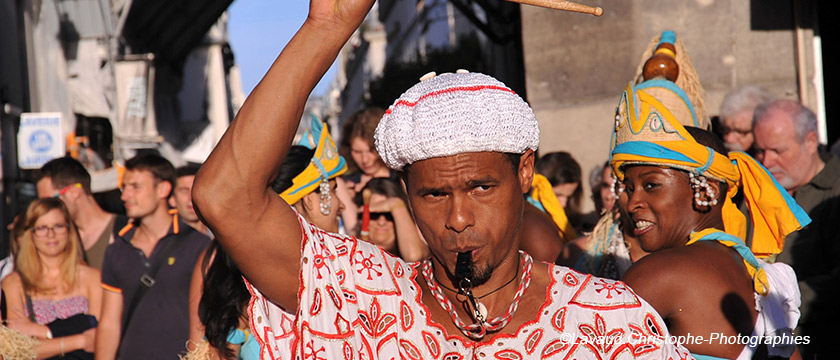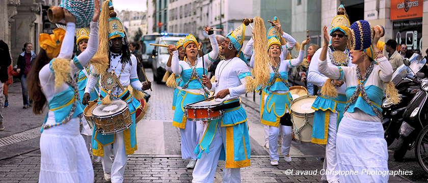 Incontournable rendez-vous de notre maracatu, le 21 juin, fête de la musique, déambulations dans les rues sinueuses du Marais…